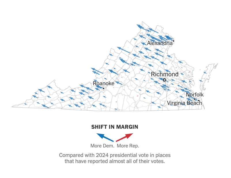 While Democrats would have had a good night even without the DOGE cuts and government shutdown, those factors definitely impacted the margin. Turnout in some counties even exceeded 2024 levels. Exit polls show 69% of youth supported Spanberger, and youth turnout increased by seven points, likely providing the margin of victory for several House of Delegate seats.